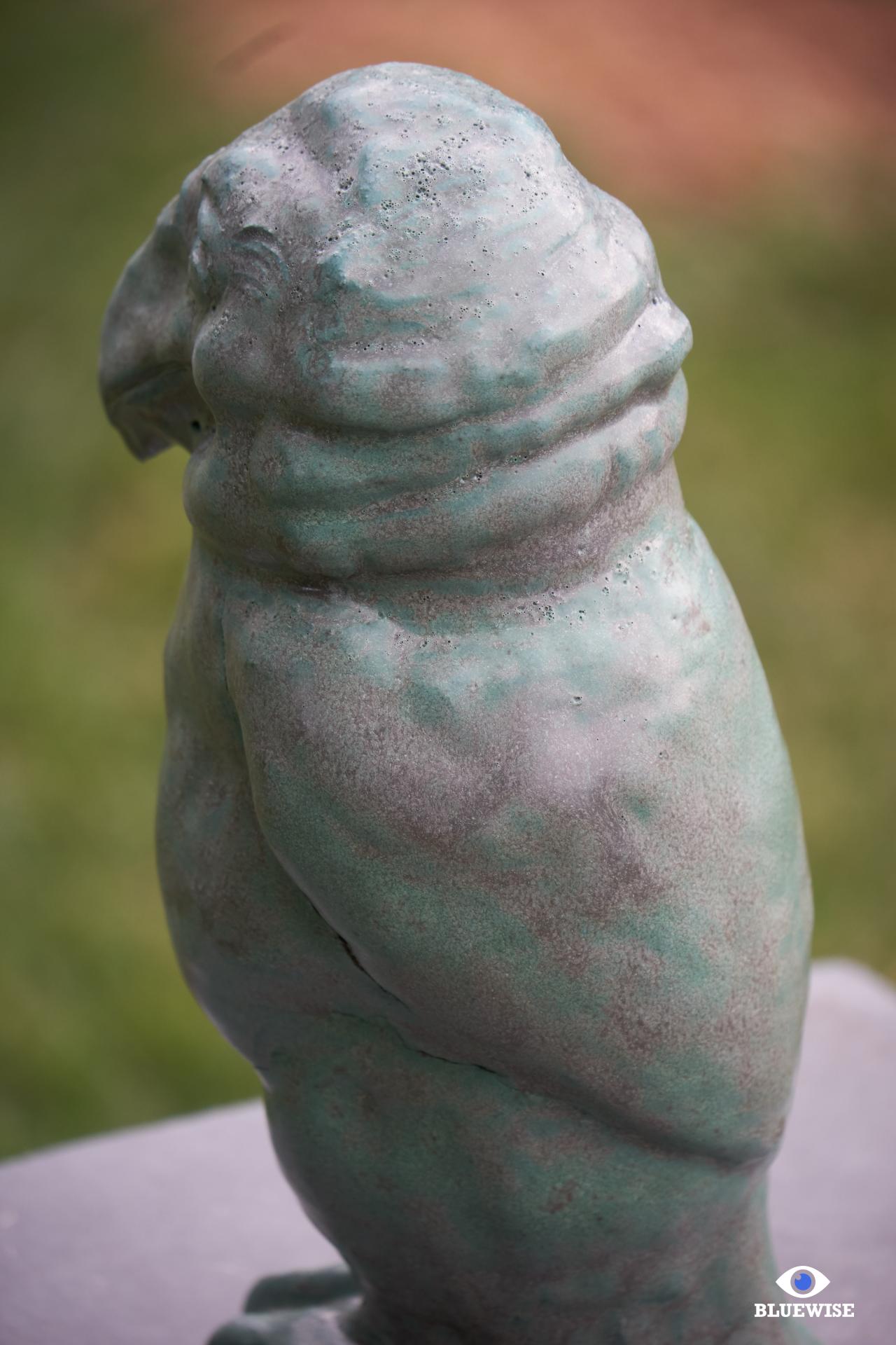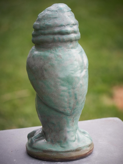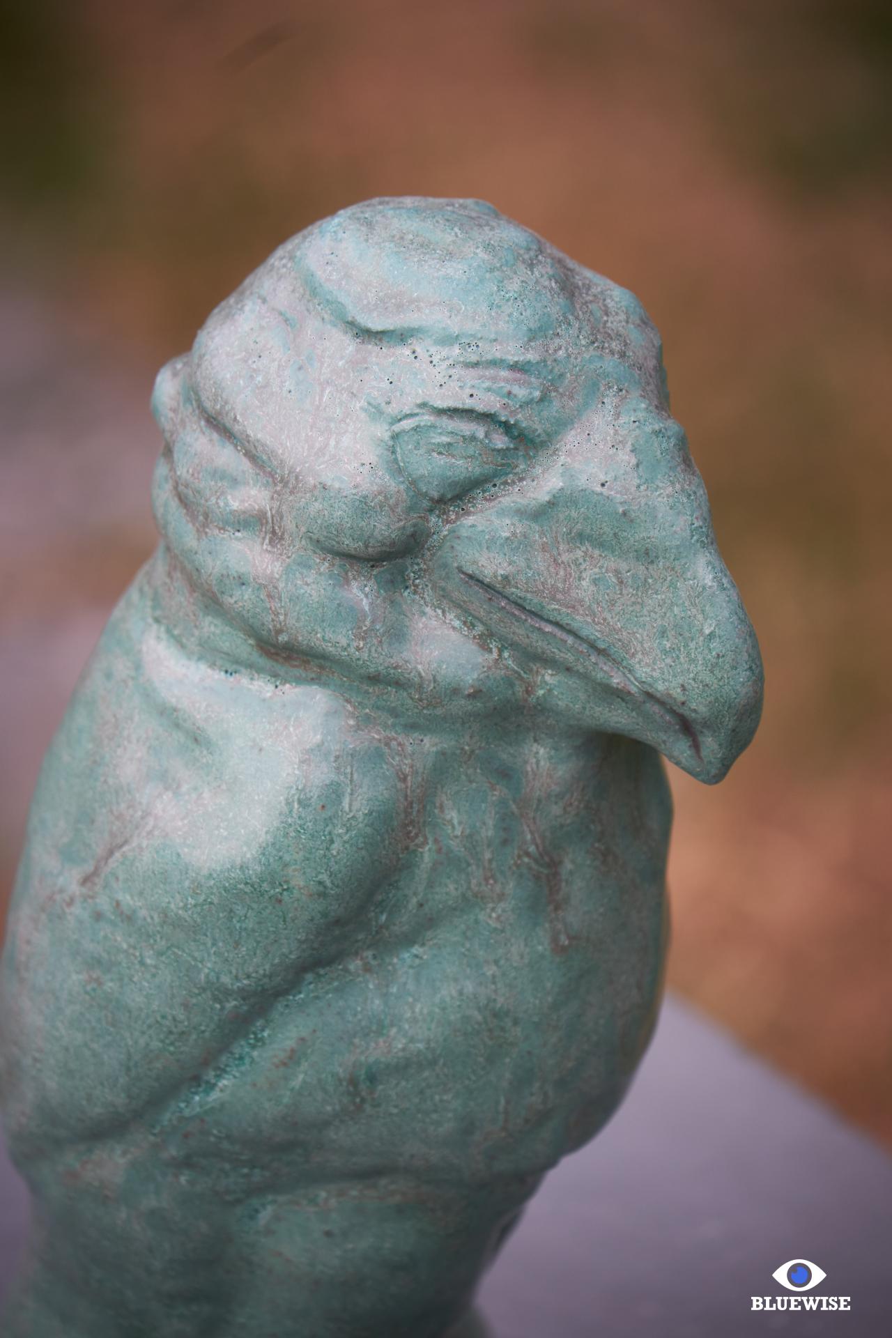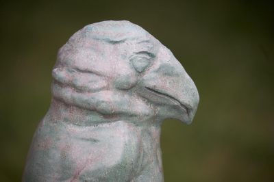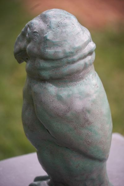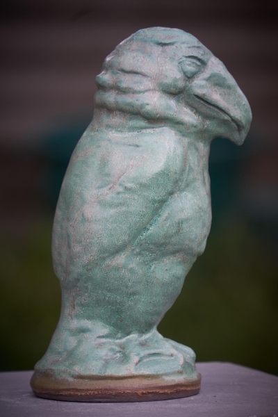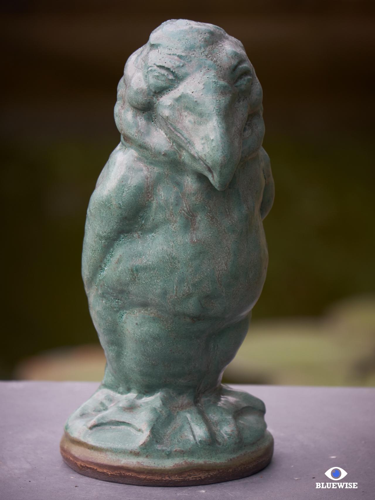 Vogel geprint in donkere klei en afgewerkt met een verweerde groene kleur.